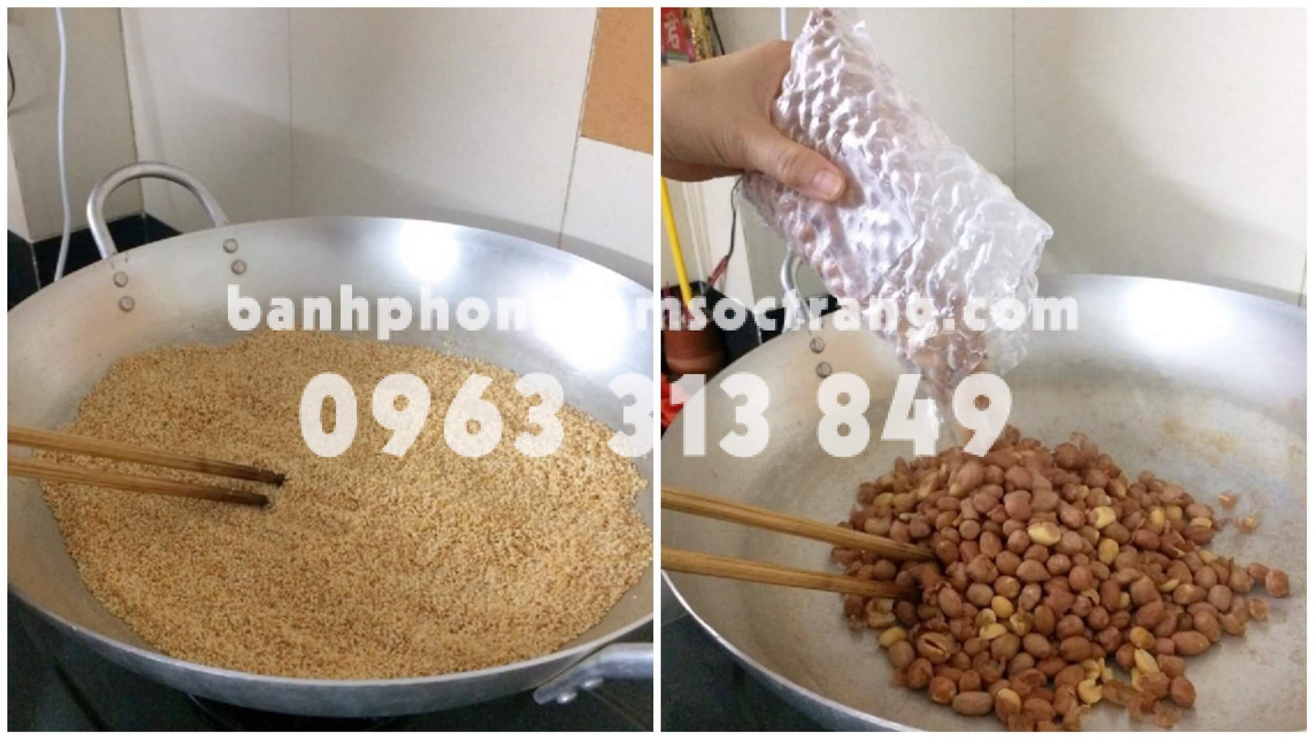 - Bắc chảo lên bếp, cho 200gr mè trắng vào rang trên lửa vừa trong khoảng 5 phút cho đến khi mè vàng và dậy mùi thơm thì đổ ra tô.