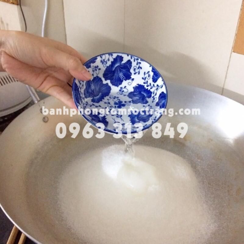 Bắc chảo lên bếp, cho vào 1 chén nước lọc và 400gr đường trắng rồi nấu với lửa vừa khoảng 10 – 15 phút cho đến khi nước đường sánh lại.