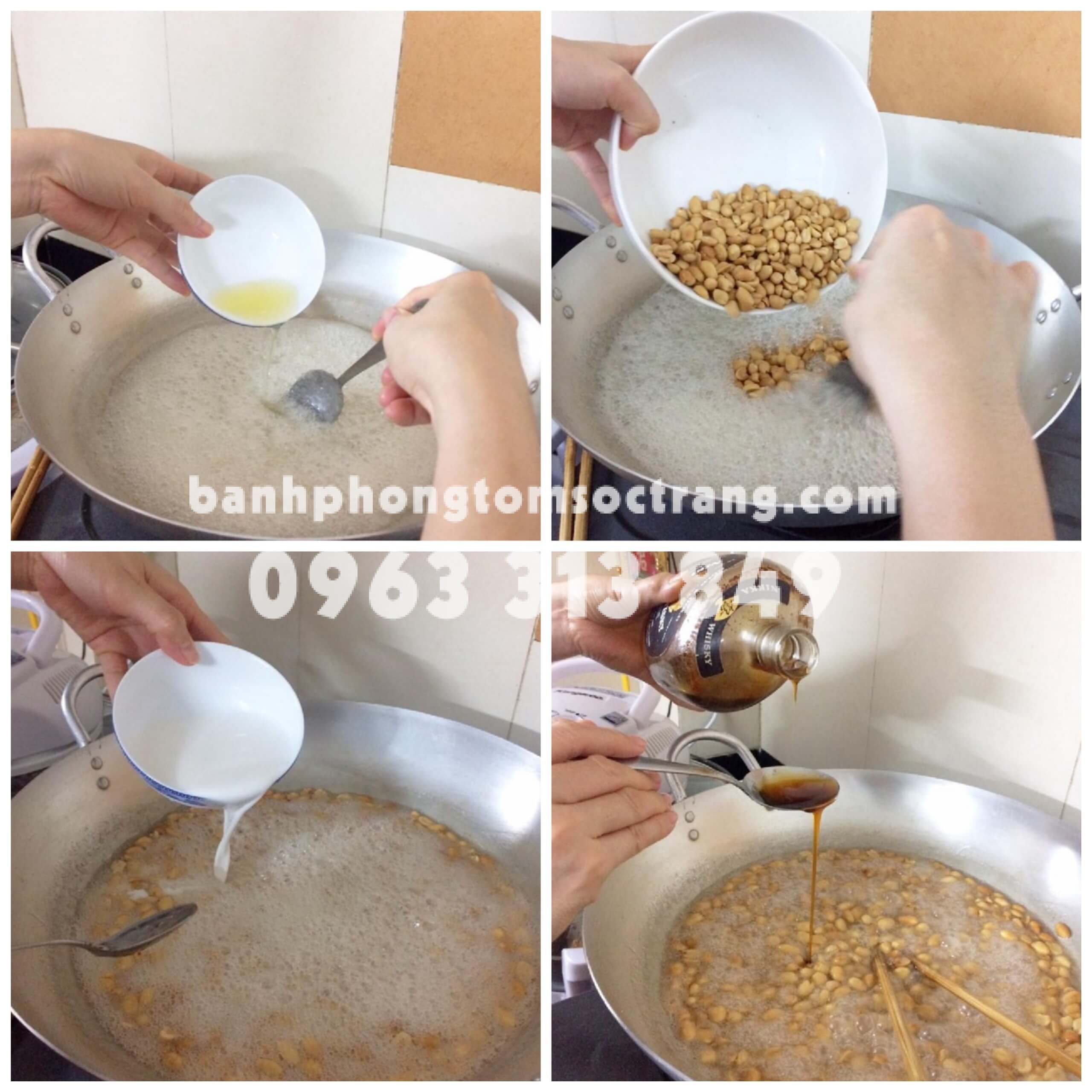 Khi nước đường đã sánh lại, dùng muỗng múc lên thấy kéo chỉ thì bạn vắt lấy nước cốt của 1 trái chanh rồi cho vào chảo nước đường, sau đó khuấy đều và nấu thêm khoảng từ 8 – 10 phút trên bếp thì cho đậu phộng đã bóc vỏ vào đảo đều.