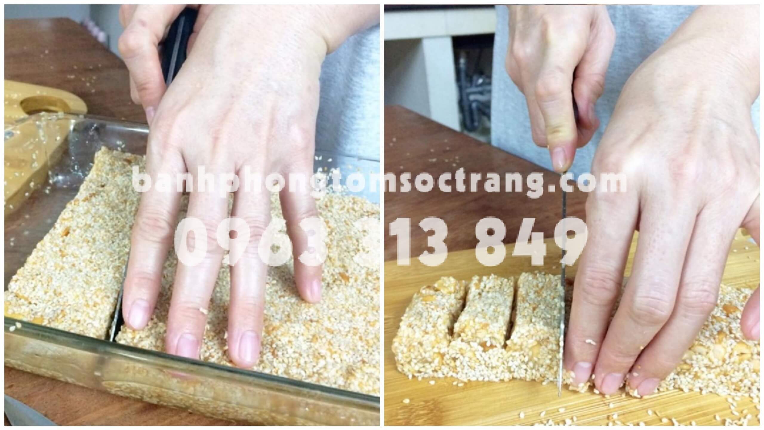 Sau khi kẹo nguội thì đổ kẹo vào khuôn, chờ khoảng từ 10 – 15 phút rồi rắc 1/2 phần mè rang còn lại phủ kín mặt trên của kẹo, tiếp tục đợi đến khi kẹo nguội hoàn toàn.